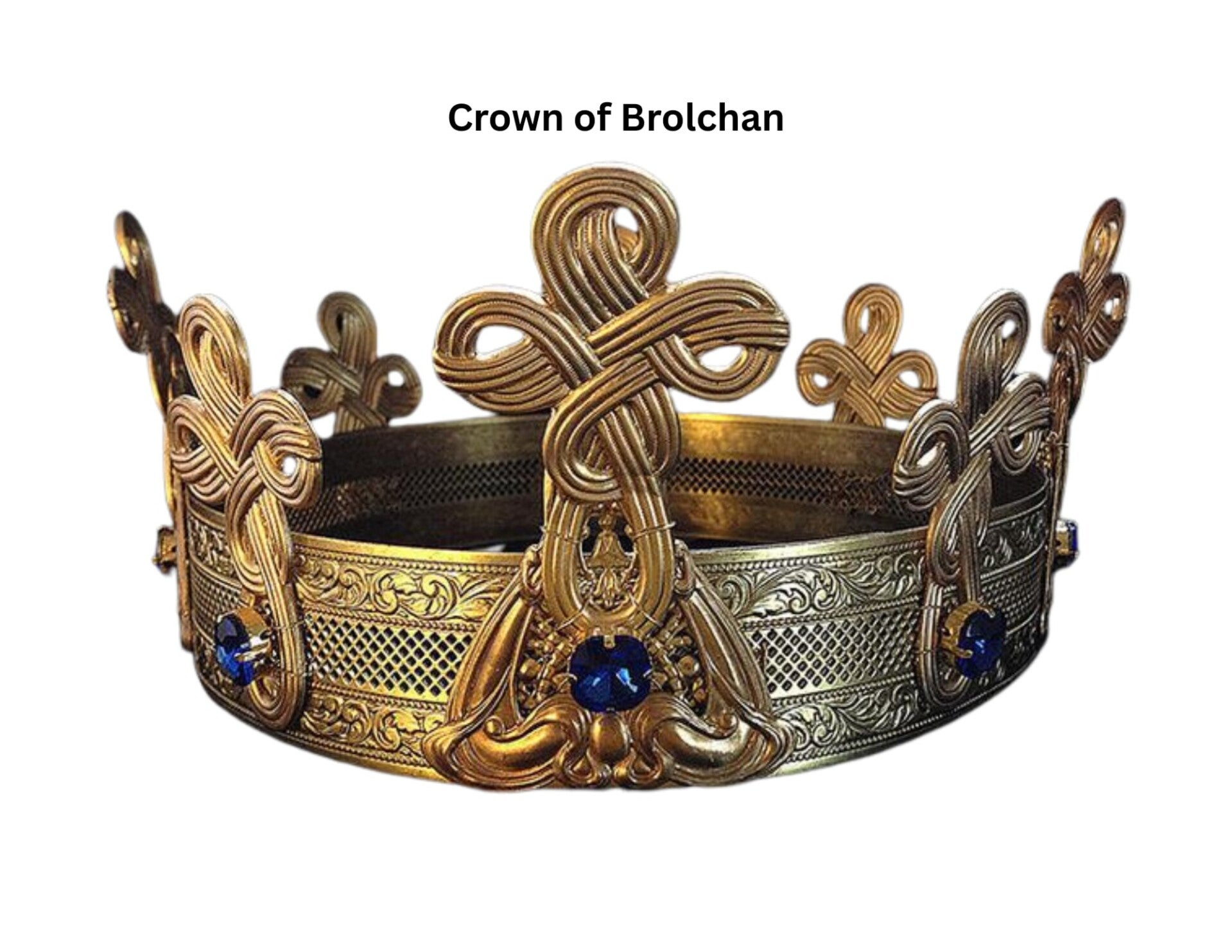 The Bronze Crown of Brolchan, Royal Prince and grandson of Suibne Menn (or Suibne mac Fiachnai, "Suibne the Stammerer, son of Fiachnae"; died AD 628) was an Irish king who is counted as a High King of Ireland. Suibne belonged to the junior branch of the Cenél nEógain kindred of the northern Uí Néill, the Cenél Feredaig, named for his grandfather Feredach, a great-grandson of Niall of the Nine Hostages.
