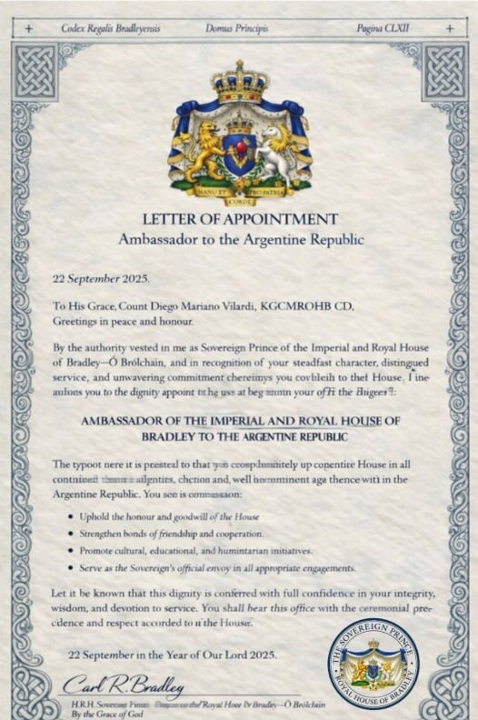 Within the Imperial and Royal House of Bradley–Ó Brólcháin, the office of Ambassador represents one of the highest expressions of trust, honour, and outward‑facing responsibility. Ambassadors are appointed personally by the Sovereign Prince and serve as his official envoys to: