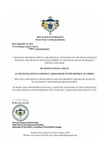 • Dr. Bishop Josiah K. Pah Sr., KMROHB CD Ambassador to the Republic of Liberia A distinguished ecclesiastical and cultural representative, strengthening ties with Liberian communities, churches, and cultural institutions.